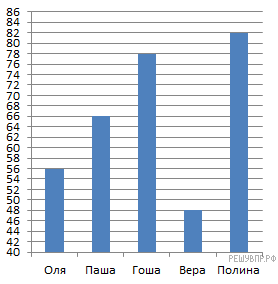 Версия для печати и копирования в MS WordНа диаграмме представлены результаты некоторых ребят, писавших тест по физике. По вертикальной оси указаны баллы. Назовите сумму баллов ребят, набравших менее 75 баллов.