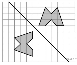 На рис. 1 на клет­ча­той бу­ма­ге изоб­ра­же­ны фи­гу­ры, сим­мет­рич­ные от­но­си­тель­но изоб­ражённой пря­мой. На­ри­суй­те на рис. 2 фи­гу­ру, сим­мет­рич­ную за­штри­хо­ван­ной фи­гу­ре от­но­си­тель­но дан­ной пря­мой.