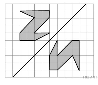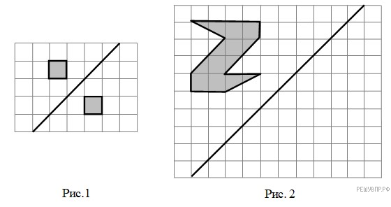 На рис. 1 на клет­ча­той бу­ма­ге изоб­ра­же­ны фи­гу­ры, сим­мет­рич­ные от­но­си­тель­но изоб­ражённой пря­мой. На­ри­суй­те на рис. 2 фи­гу­ру, сим­мет­рич­ную за­штри­хо­ван­ной фи­гу­ре от­но­си­тель­но дан­ной пря­мой.